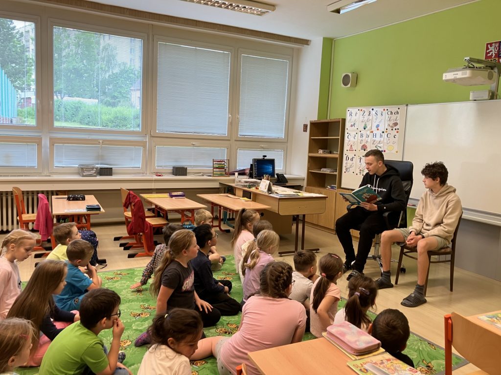 Žáci 9. třídy Adam a Matyáš četli v pátek 17. 5. v hodině Čj pohádky svým mladším spolužákům z 1. B.