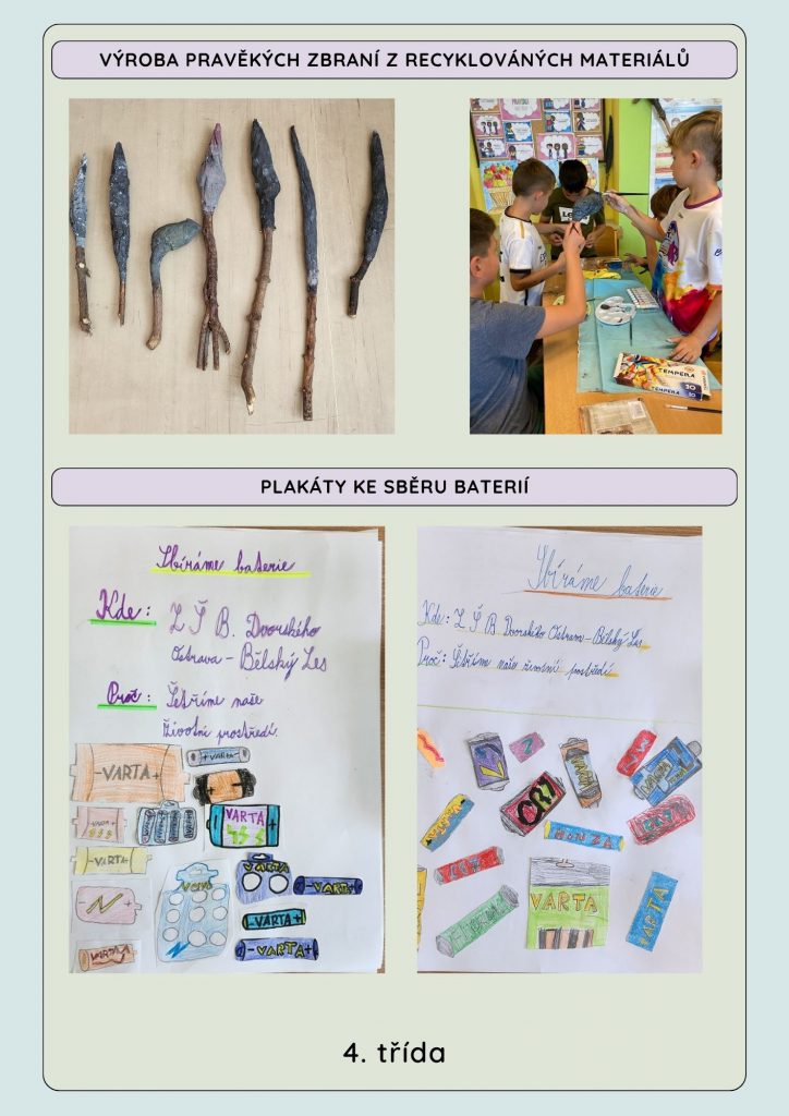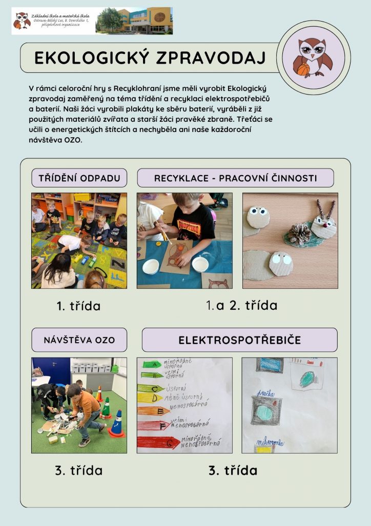 V rámci celoroční hry s Recyklohraní jsme měli vyrobit Ekologický zpravodaj zaměřený na téma třídění a recyklaci elektrospotřebičů a baterií. Naši žáci vyrobili plakáty ke sběru baterií, vyráběli z již použitých materiálů zvířata a starší žáci pravěké zbraně. Třeťáci se učili o energetických štítcích a nechyběla ani naše každoroční návštěva OZO.    P. Gawlasová
