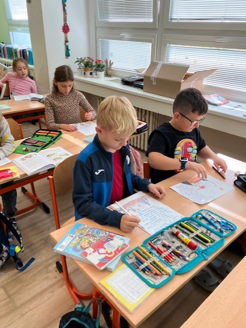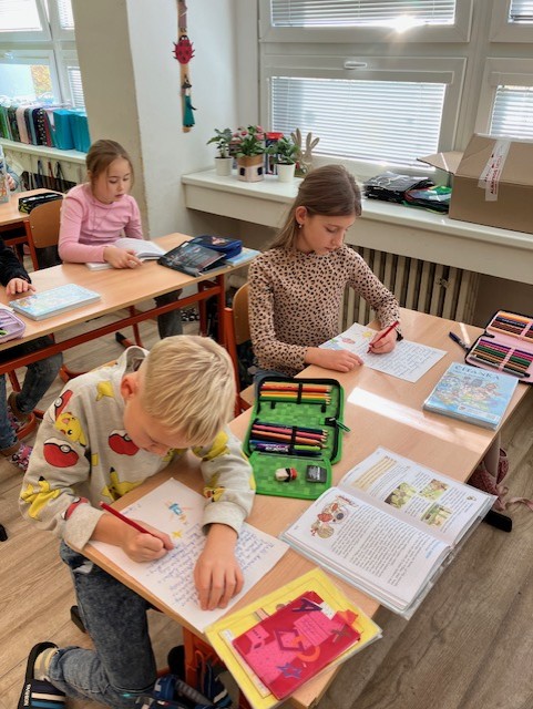 Žáci 3.B v hodině českého jazyka napsali dopis třeťákům z Rakovnika. Moc se všichni těšíme na jejich odpovědi!