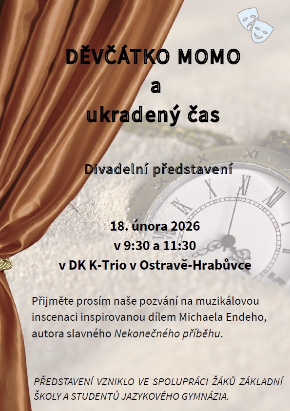 Děvčátko Momo a ukradený čas. Takovým názvem se honosilo představení – muzikál, které 18. 2. v K-triu navštívili žáci 6. až 9. tříd. Ovšem náš čas strávený v divadle ztracený rozhodně nebyl. Představení vyprávělo příběh osiřelé holčičky Momo, která žije ve světě, kde se jedna organizace snaží doslova sebrat lidem čas. Momo se tak vydává na dobrodružnou, cestu aby zabránila celé organizaci v jejich plánu a zachránila své kamarády.