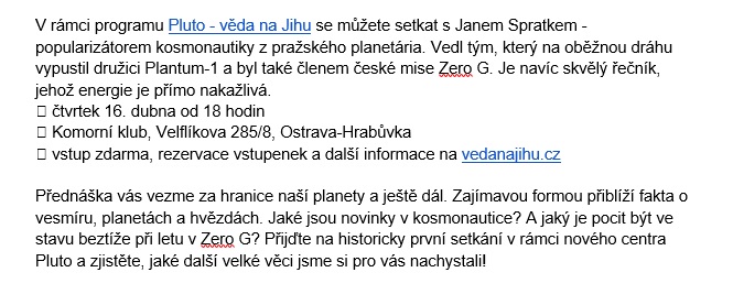 Pozvánka na přednášku rámci programu Pluto – věda na Jihu – text, plakát