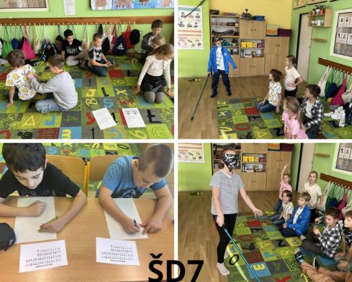 Celý týden si ve všech odděleních děti vyzkoušely, jak těžké je dělat zcela obyčejné věci poslepu. Mohly využívat všechny smysly kromě zraku. Poznávat spolužáky a různé předměty hmatem, malovat se zavázanýma očima, navlékat korálky, hrát hmatová pexesa, dojít se slepeckou holí k určenému cíli, pomocí čichu a chuti poznat potraviny a koření. Velmi zajímavé bylo i seznámení s Braillovým písmen.